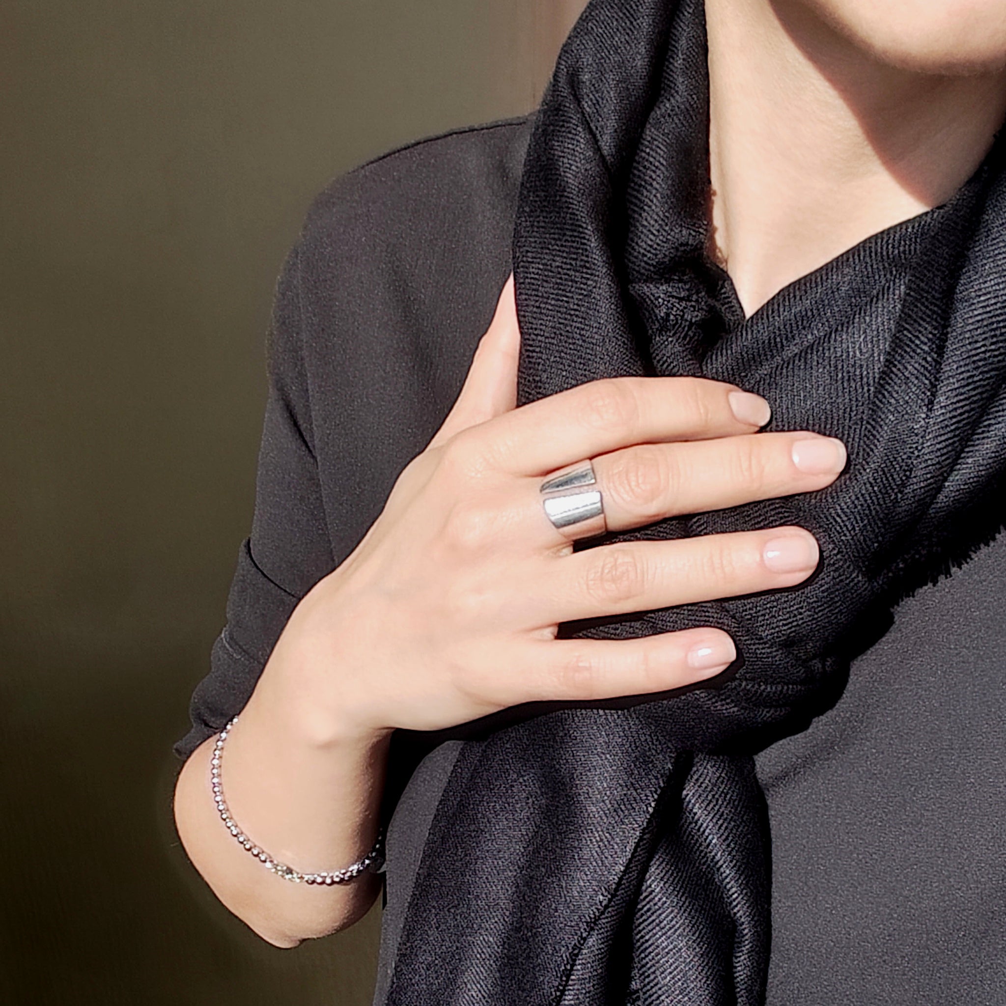 Broad geometric ring in solid Sterling Silver. One of the minimalist yet statement pieces from our collection. A stylish and geometric ring that wraps delicately around your finger. A tiny diagonal gap on top of the ring adds an unusual detail to this elegant design and allows you to adjust the size.