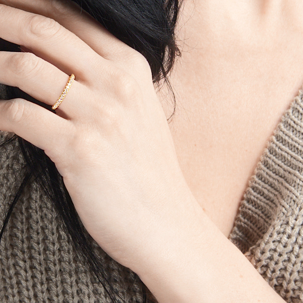 Nuance ring in 18 K Gold Plating features white zircon stones. An extra delicate yet noticeable ring brings any outfit to the next level. It will add a feminine charm and spark to your ring collection.