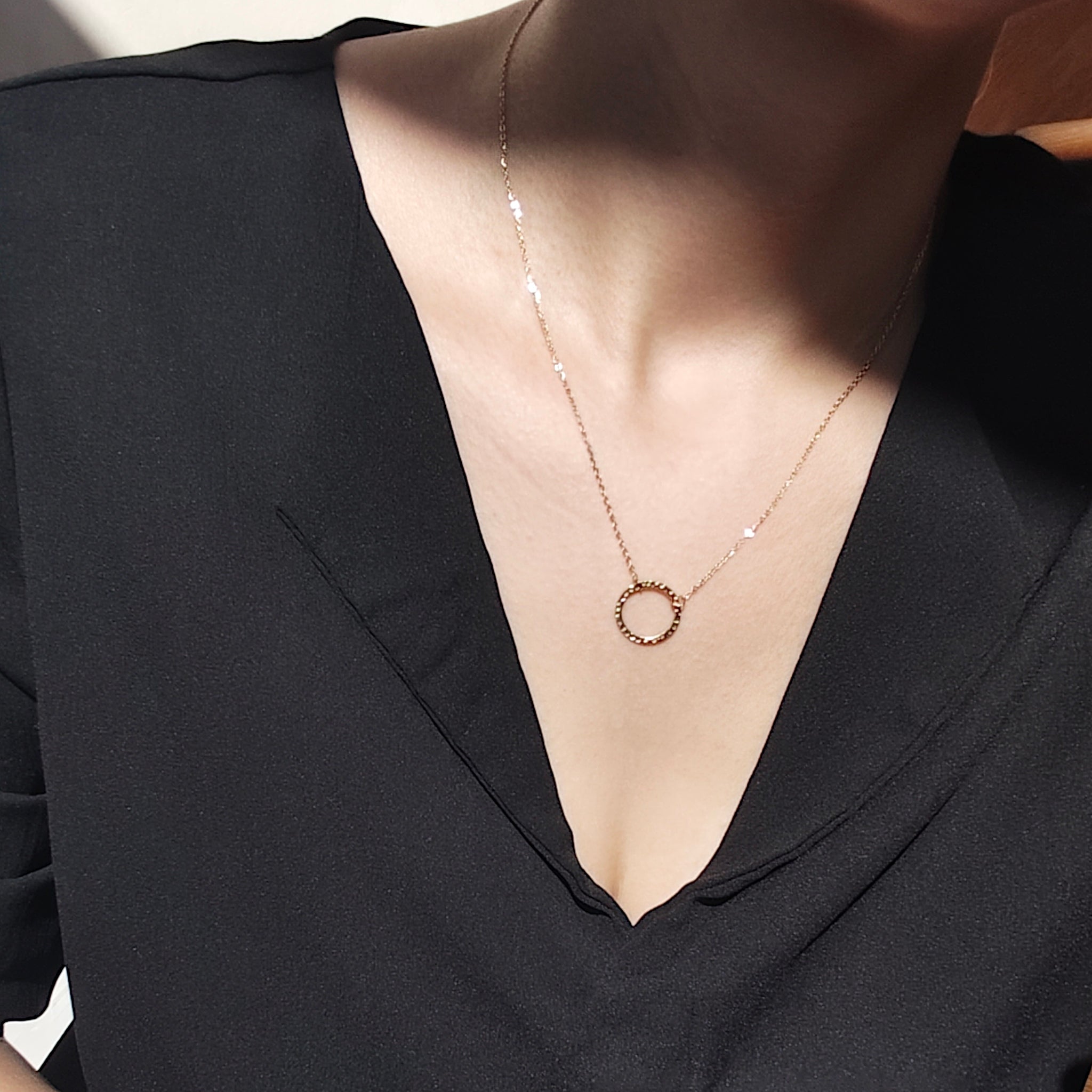 Delicate Eva chain necklace with hoop pendant reflects what a minimalist style is all about. This necklace creates a romantic and feminine feel. Pair it with gold rings that add a tiny glint to the hands and thin hoop earrings or simple studs to create a look perfect in its simplicity.