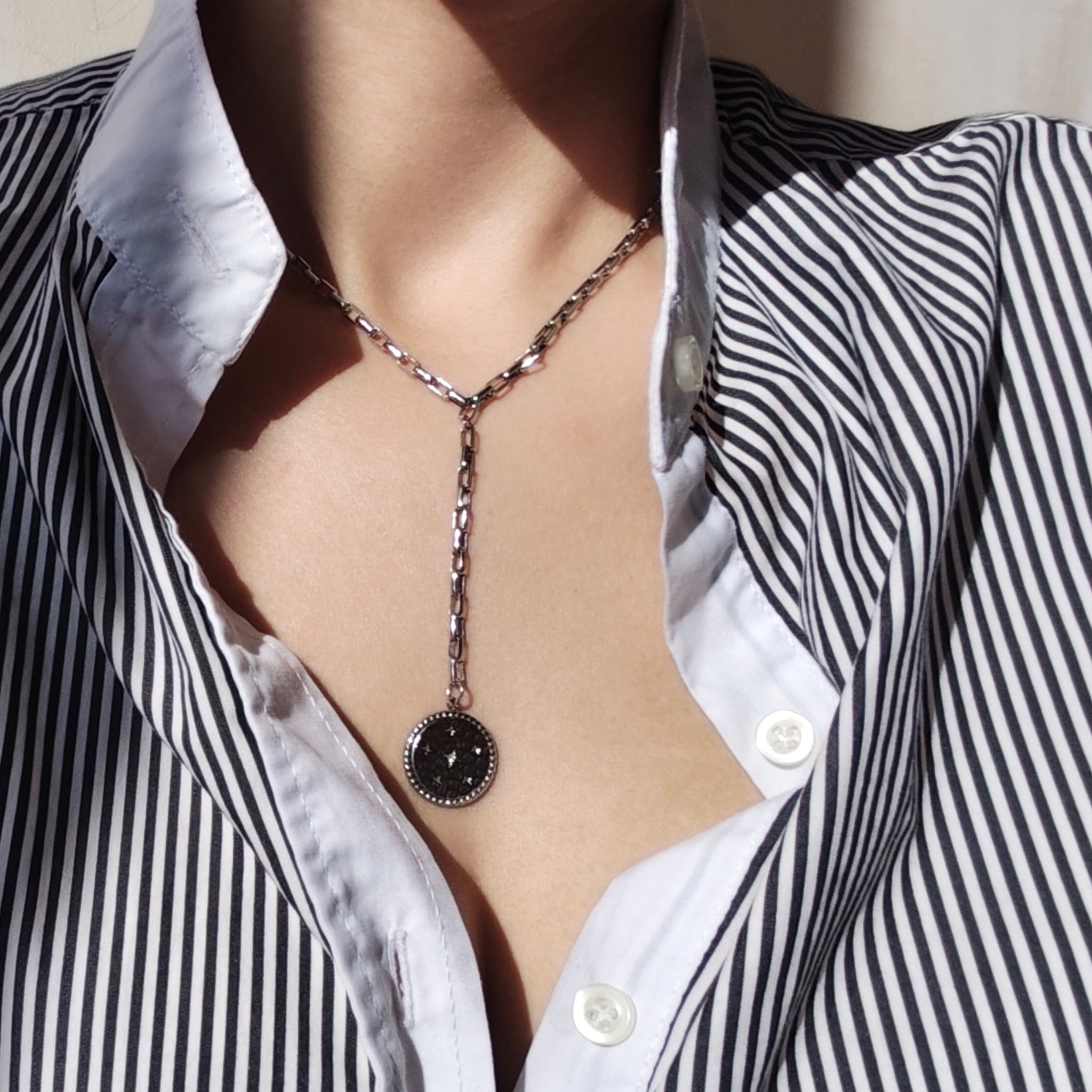 Le collier chaîne Alexa avec un pendentif pièce ronde avec surface martelée et pierre est moderne et rafraîchissant. Que vous soyez une fille en t-shirt ou une femme d'affaires, ce collier ajoutera une touche glamour à n'importe quel style que vous choisirez.