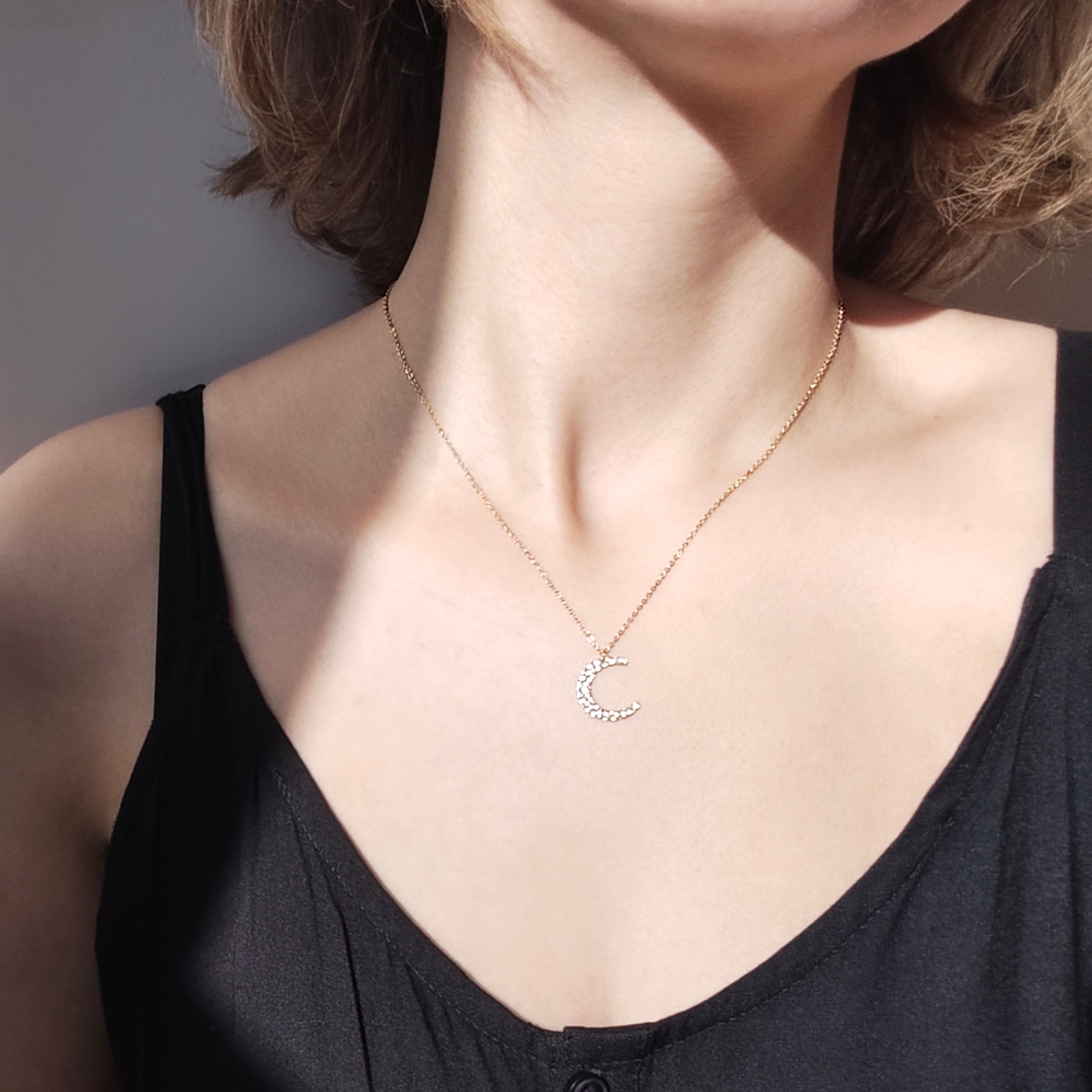 Découvrez le collier Nova doté d'un pendentif lune avec une surface texturée semblable à celle de la Lune qui joue avec les ombres. Ce collier chaîne délicat sera un complément parfait à un look romantique et féminin. Associez-le à un collier plus long ou à un collier de perles de notre collection.
