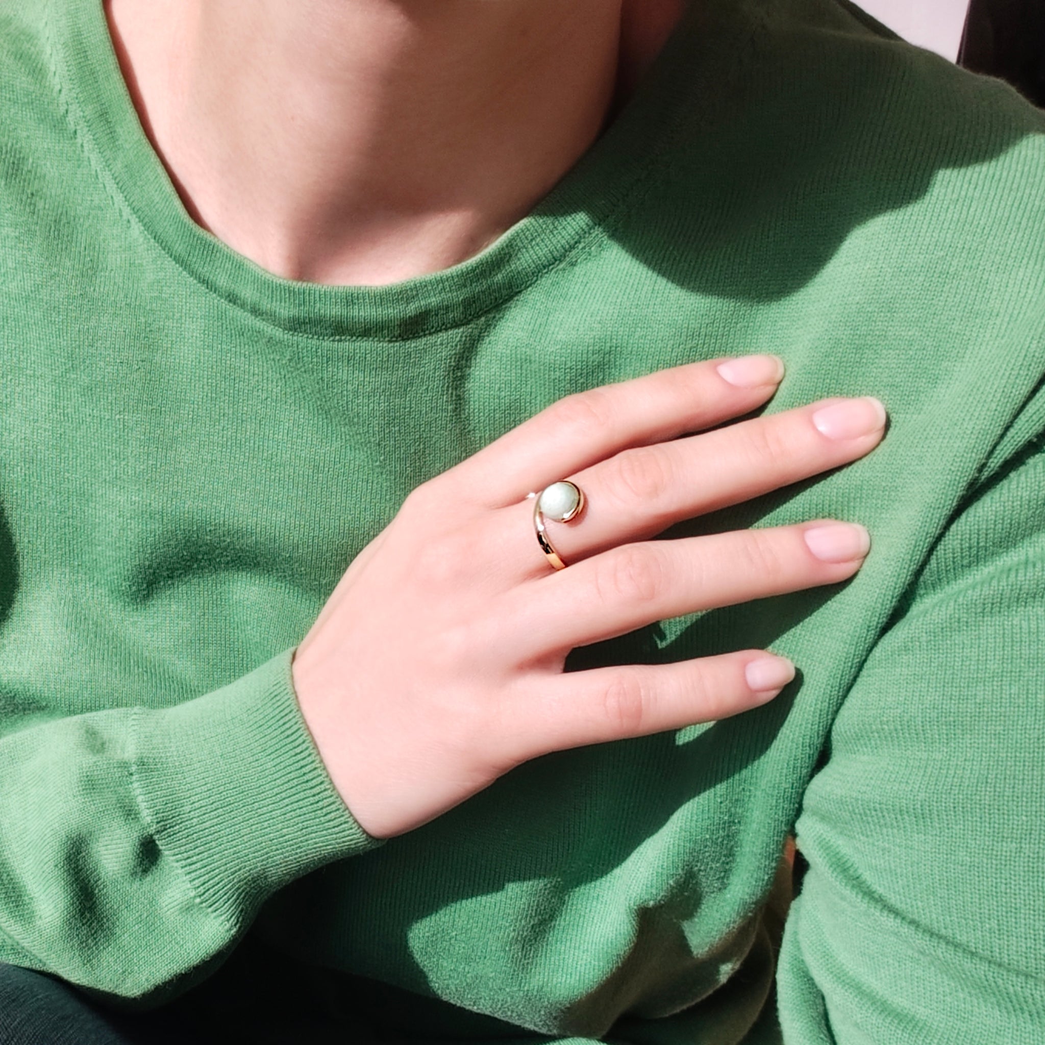 Une bague fabriqué à la main en argent sterling plaquée or 18 carats avec une pierre turquoise verte. Un petit espace sur le dessus de la bague ajoute un détail inhabituel à ce design et vous permet d'ajuster la taille. Cette bague est fabuleuse sur une peau bronzée ou une peau foncée.
