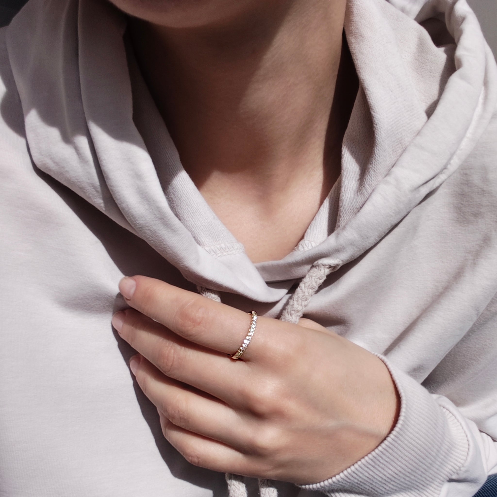 La bague Nuance en Plaqué Or 18 carats est ornée de pierres de zircon blanc. Une bague extra délicate mais visible fait passer n'importe quelle tenue au niveau supérieur. Il ajoutera un charme féminin et une étincelle à votre collection de bagues.