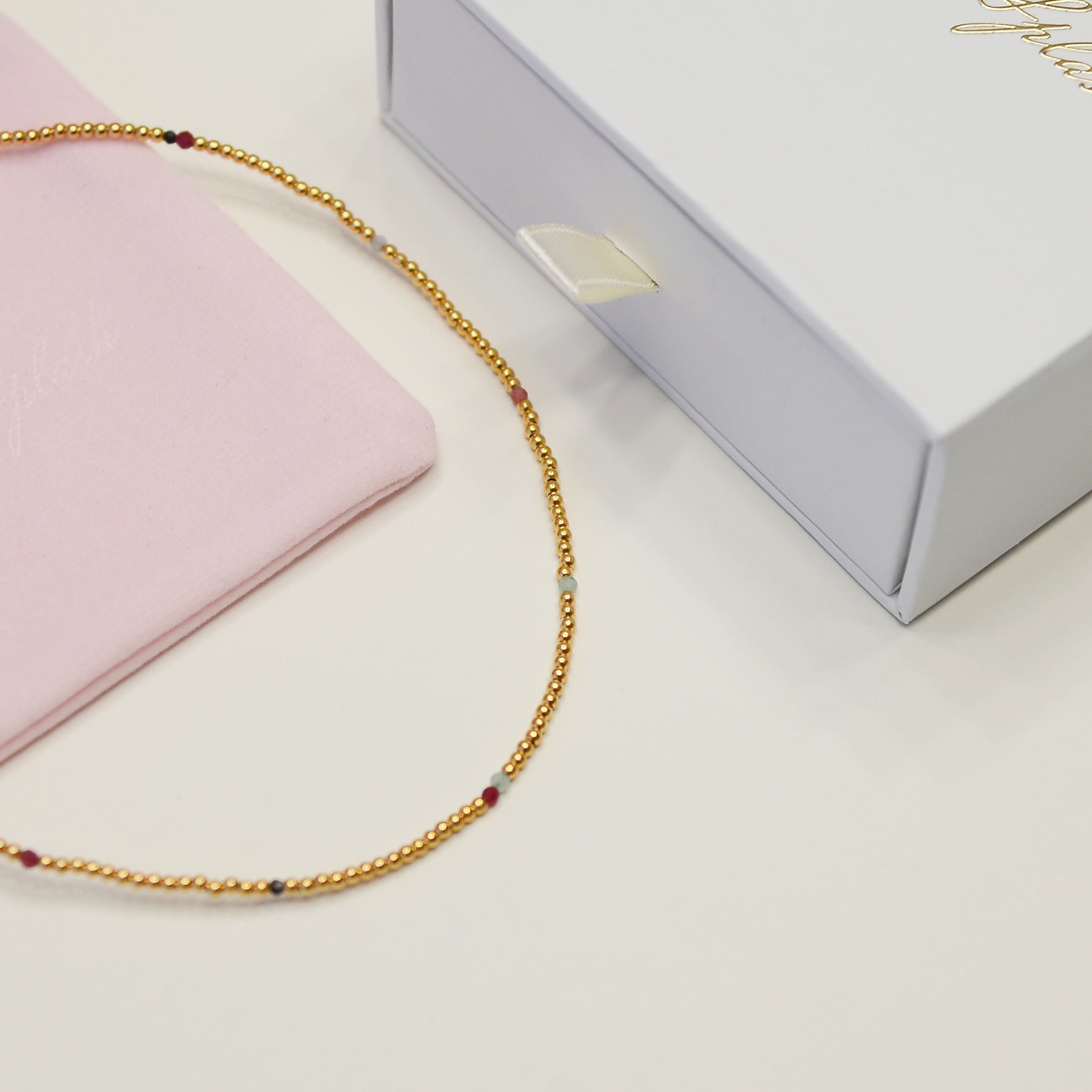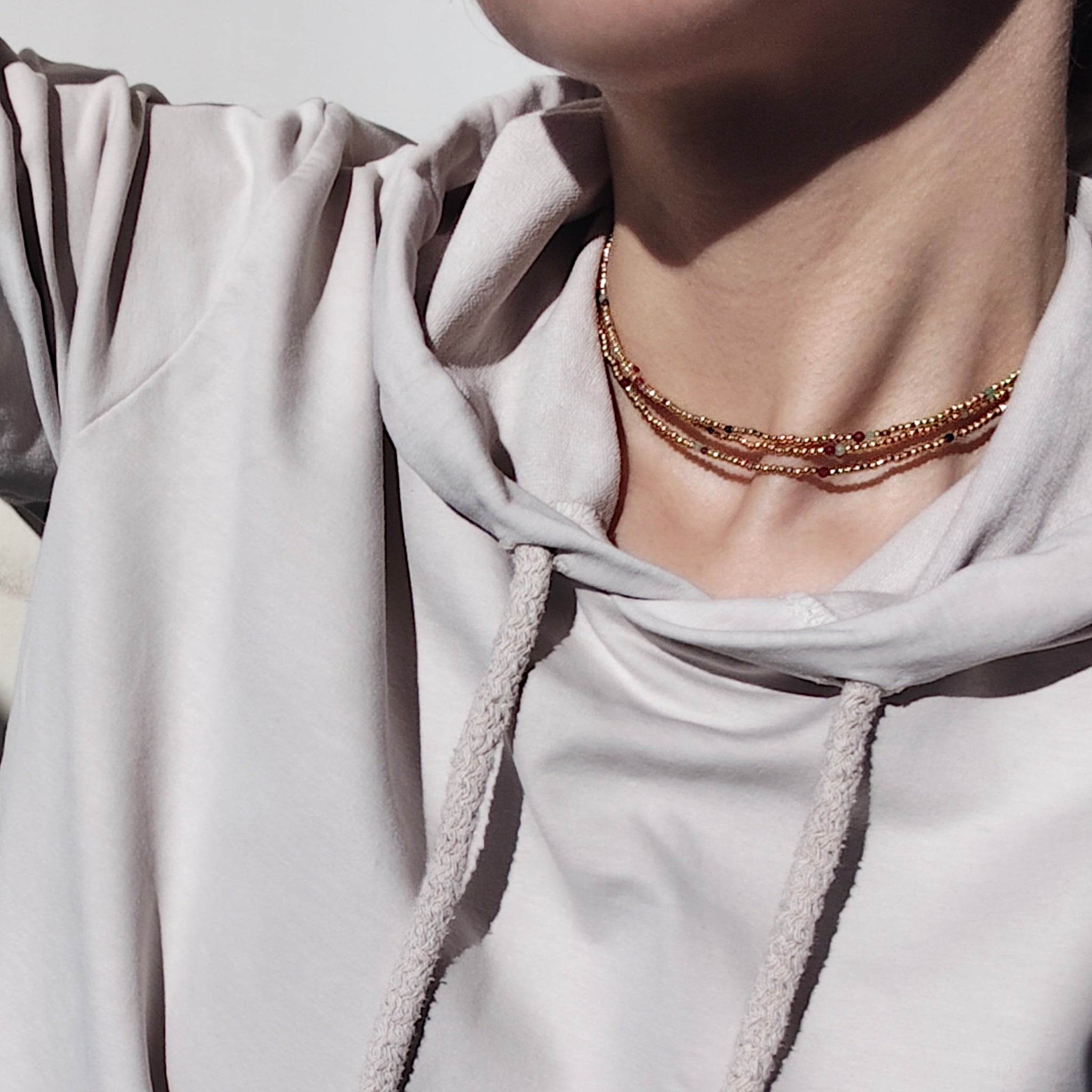 The round Gold Plated and colorful beads conjure up a fascinating texture in this necklace. Pair it with a longer chain for the evening look, or even wear it as a bracelet. An ideal match for a blazer or cool knitted top. Enjoy the freedom of styling with such a versatile necklace.