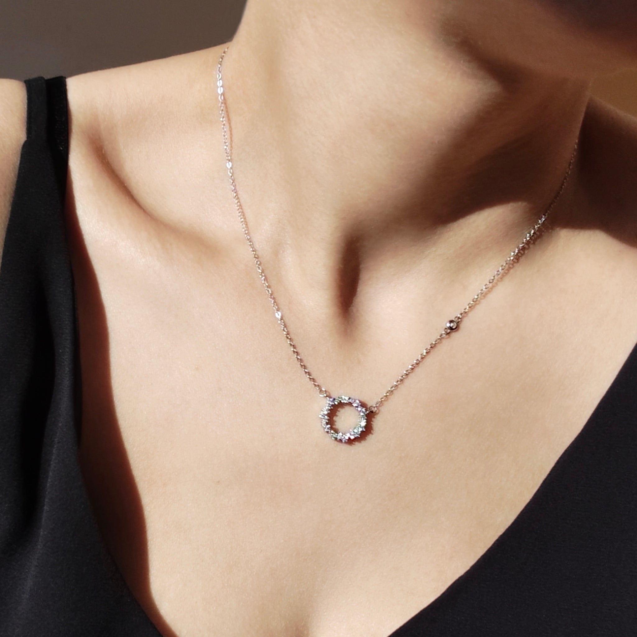 Discover magical and simple beauty with the Nuance Necklace, a small circle pendant filled with tiny crystals. An additional stone on a chain adds extra detail and feels luxurious. Layer it with other classic chains for a more elevated look. It is one of the timeless pieces that will be an excellent choice for a present.